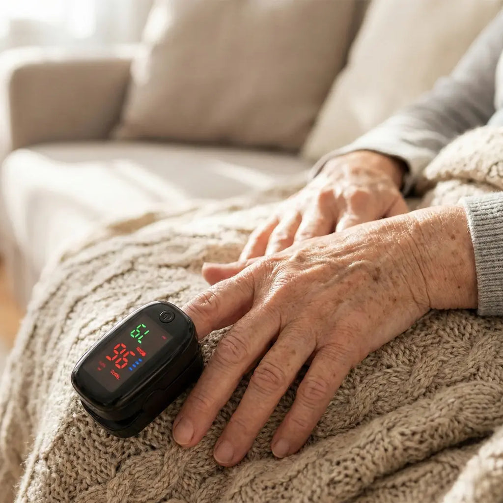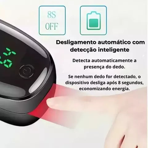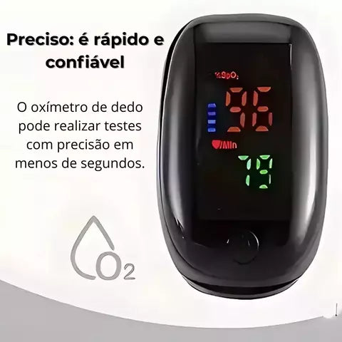 O oxímetro de pulso mede a saturação de oxigênio no sangue e a frequência cardíaca em tempo real, auxiliando no acompanhamento da saúde respiratória.