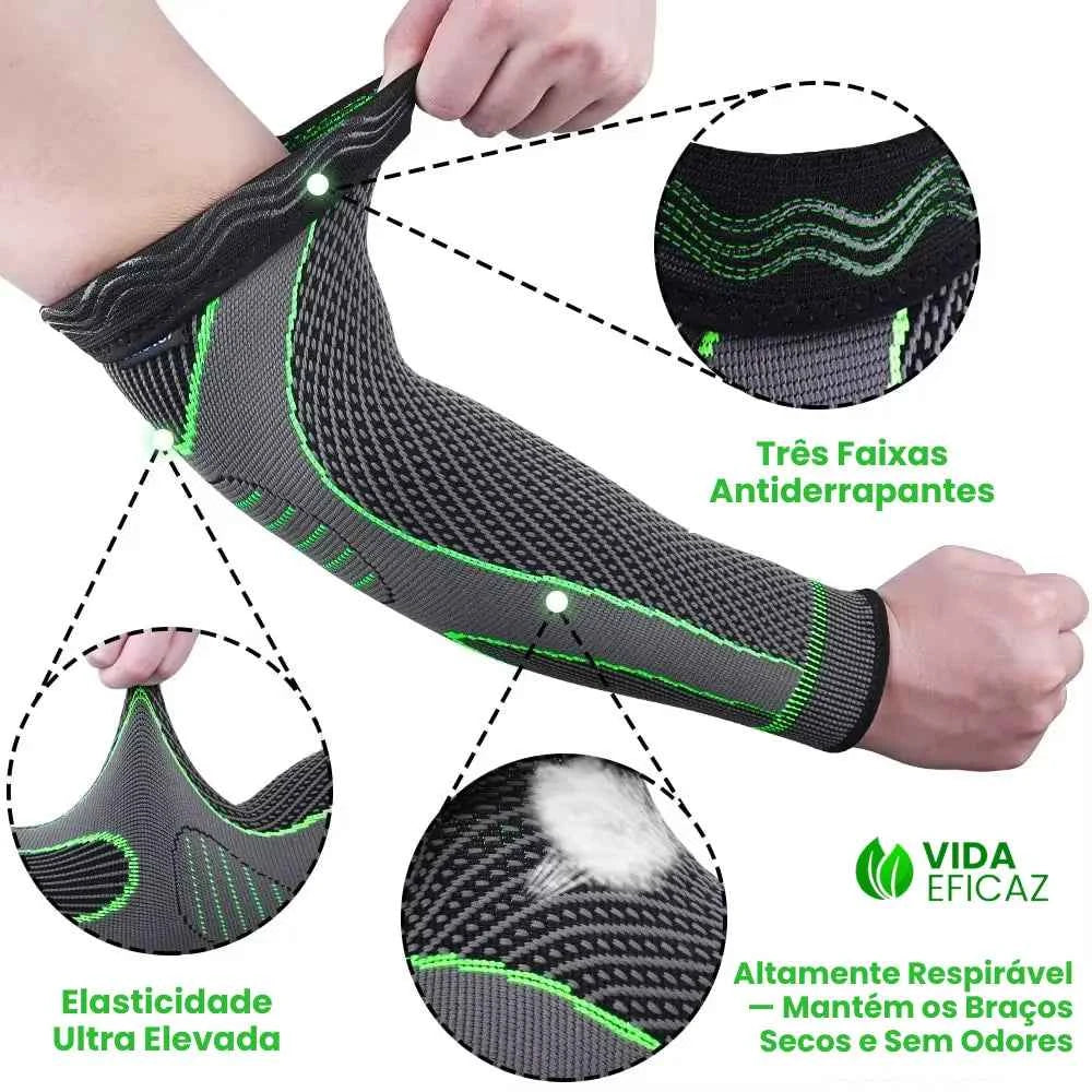 Projetada com compressão graduada e tecido técnico de alto desempenho, ela envolve todo o braço com sustentação estratégica, reduzindo impacto, inchaço e tensões que prejudicam seu rendimento físico e sua qualidade de vida.