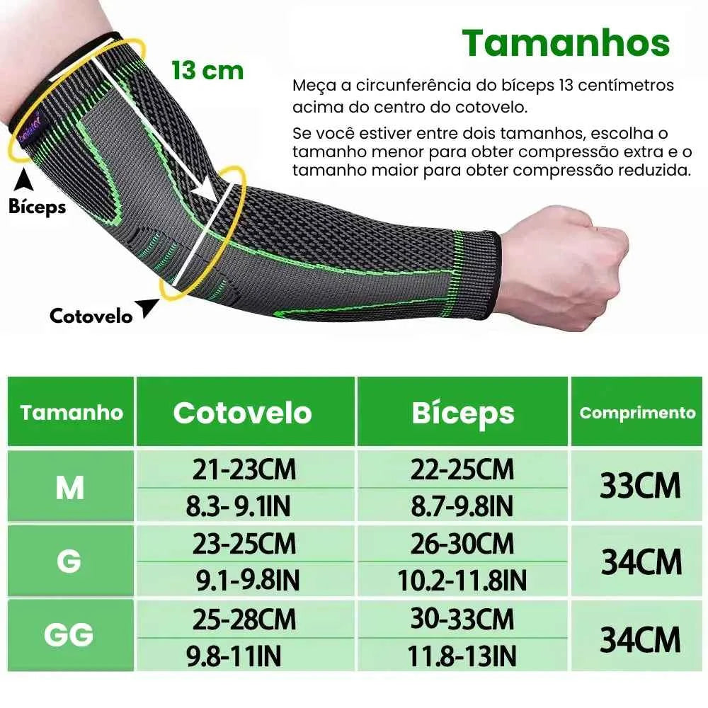 A compressão graduada começa mais firme na região do cotovelo e suaviza em direção ao braço, estimulando a circulação e diminuindo o risco de inchaço. Isso melhora a recuperação muscular, evita agravamento de lesões e mantém sua performance mais estável durante qualquer atividade.